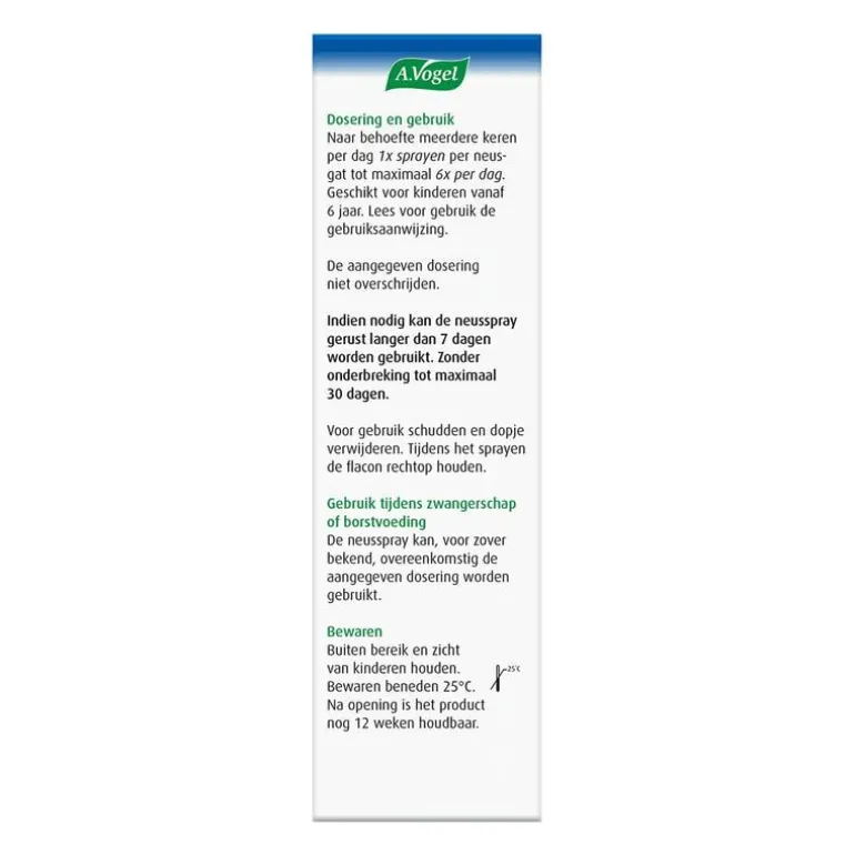 Naar behoefte meerdere keren per dag 1x sprayen per neusgat. Volwassenen: tot maximaal 6x per dag. Kinderen vanaf 6 jaar: tot maximaal 2 à 3x per dag. De aanbevolen dosering niet overschrijden.