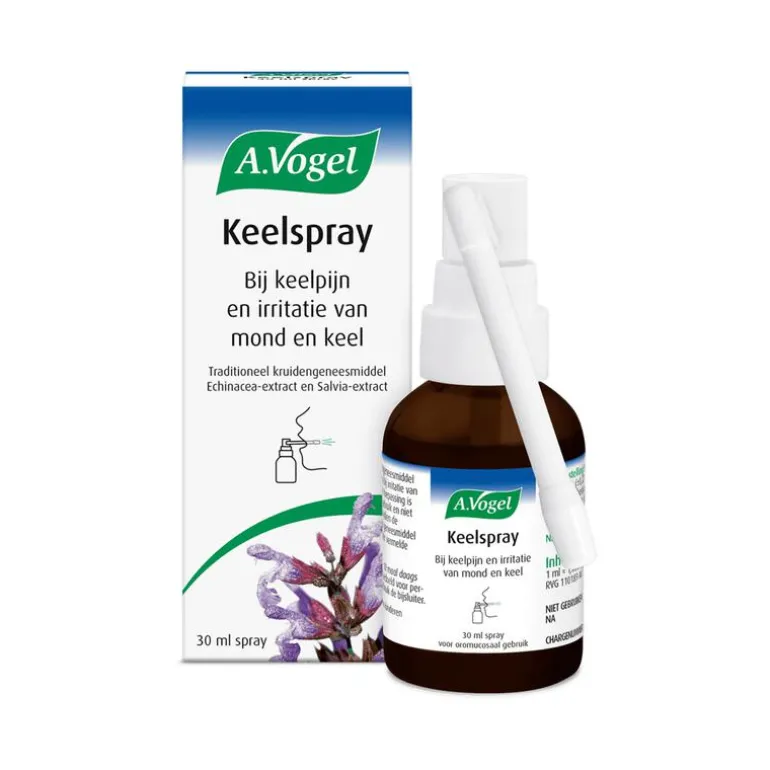 Samenstelling: De actieve bestanddelen zijn ethanolextracten van verse Echinacea purpurea-planten (rode zonnehoed) en van verse bladeren van Salvia officinalis (salie). Een spraydosering A.Vogel Keelspray (±0,22 ml) bevat extracten van Echinacea purpurea en Salvia officinalis, overeenkomend met 54-97 mg vers kruid van Echinacea purpurea, 2,6-5,1 mg verse wortels van Echinacea purpurea en 22-39 mg verse bladeren van Salvia officinalis.