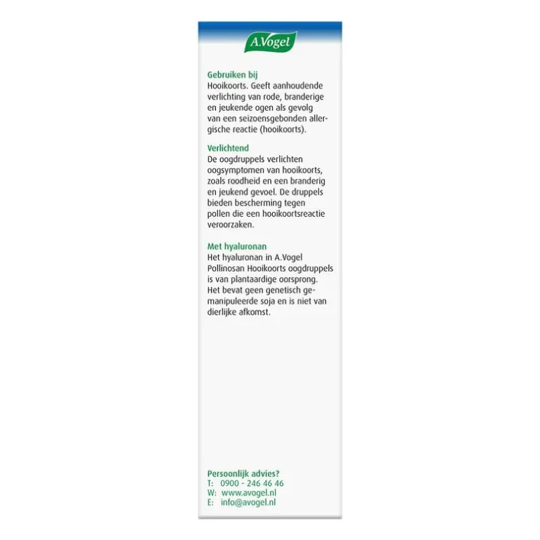 Kinderen vanaf 7 jaar: 1-2x daags in beide ogen 1 druppel nadat een arts is geraadpleegd A.Vogel Pollinosan Hooikoorts oogdruppels kan bij kinderen vanaf 7 jaar gebruikt worden, mits vooraf door een huisarts is vastgesteld dat de oogproblemen niet een andere medische behandeling vereisen. De maximale gebruiksduur bij kinderen dient te worden vastgesteld door een arts, maar deze mag de 30 dagen niet overschrijden.