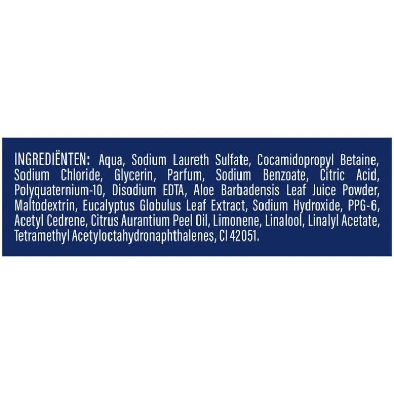 Aqua, Sodium Laureth Sulfate, Cocamidopropyl Betaine, Sodium Chloride, Glycerin, Parfum, Sodium Benzoate, Citric Acid, Polyquaternium-10, Disodium EDTA, Aloe Barbadensis Leaf Juice Powder, Maltodextrin, Eucalyptus Globulus Leaf Extract, Sodium Hydroxide, PPG-6, Acetyl Cedrene, Citrus Aurantium Peel Oil, Limonene, Linalool, Linalyl Acetate, Tetramethyl Acetyloctahydronaphthalenes, CI 42051.