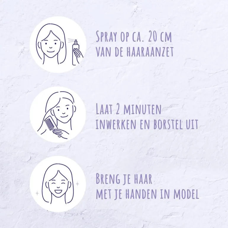 De fles goed schudden voor gebruik. Breng de droogshampoo aan op droog haar en spuit op ca. 20 cm afstand de droogshampoo op de haaraanzet. Laat de haarspray 2 minuten inwerken en borstel uit of föhn je haar. Breng je haar vervolgens in model met je handen en creëer je eigen nonchalante look. Gebruik voor een optimaal resultaat ook de andere haarproducten uit de Andrélon Verrassend Volume-lijn.