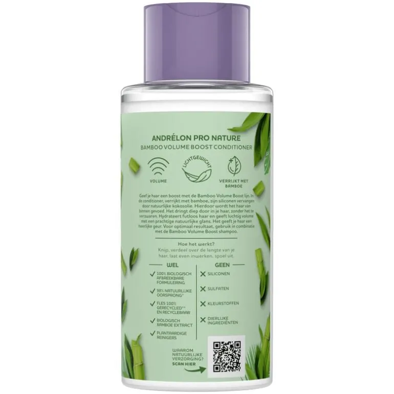 ANDRÉLON PRO NATURE BAMBOO VOLUME BOOST CONDITIONER, VERRIJKT MET BAMBOE, HYDRATEERT FUTLOOS HAAR EN GEEFT LUCHTIG VOLUME MET EEN PRACHTIGE NATUURLIJKE GLANS.• Andrélon Pro Nature Bamboo Volume Boost Conditioner hydrateert intensief• De conditioner bevat geen sulfaten en siliconen is verrijkt met bamboe• Geeft futloos haar luchtig volume met een prachtige natuurlijke glans• De Bamboo Volume Boost Conditioner is 100% biologisch afbreekbaar• Conditioner gemaakt met 98% ingrediënten van natuurlijke oorsprong*• De fles van deze conditioner is recyclebaar en is 100% gerecycled** plastic