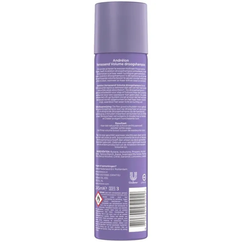 Andrélon Verrassend Volume Droogshampoo, om zonder je haren te wassen toch een frisse look te krijgen. In een handomdraai is je haar weer luchtig en gemakkelijk te stylen. Andrélon droogshampoo is dé oplossing om je haar een verfrissende volumeboost te geven zonder een witte waas achter te laten. Wanneer je maar wilt en waar je ook bent! Andrélon Verrassend Volume Droogshampoo bevat 100% natuurlijk tapiocazetmeel dat vet van het haar op een natuurlijke wijze absorbeert. Het is speciaal ontwikkeld voor slap, futloos haar dat tussen styling en wasbeurten door een oppepper kan gebruiken. De unieke formule met Lift-up System zorgt ervoor dat het vet bij de haaraanzet wordt opgenomen en het haar meer volume krijgt, waardoor het weer licht en luchtig valt.