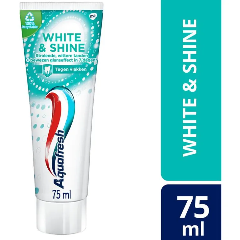 Aquafresh White&Shine tandpasta bevat microparels die het tandoppervlak op milde wijze (1) schoon, (2) glad en (3) witter maken – voor een klinisch bewezen glanseffect in 7 dagen en stralende, gladde, wittere tanden. Het is klinisch bewezen dat de Aquafresh White&Shine tandpasta helpt de tanden langer stralend wit te houden. Houd je mond gezond met de vertrouwde 3-voudige bescherming van Aquafresh tandpasta: gezond tandvlees, sterke tanden, frisse adem.