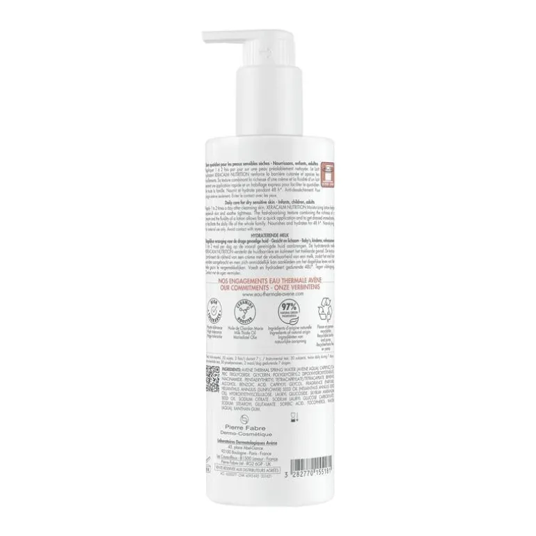 Hydraterende en voedende melk voor de gevoelige en droge huid van het hele gezin. Deze dagverzorging met hoge tolerantie bestaat voor 97% uit bestanddelen van natuurlijke oorsprong. Deze crème versterkt de huidbarrière van gezicht en lichaam. Vermindert het trekkerige gevoel, voedt en hydrateert de huid 48 uur lang