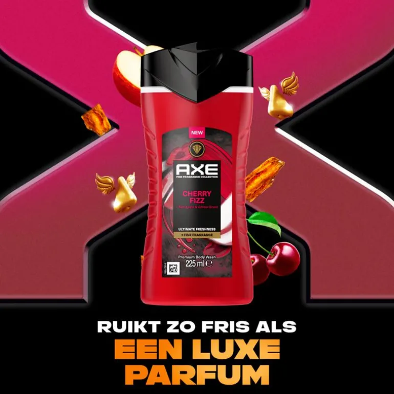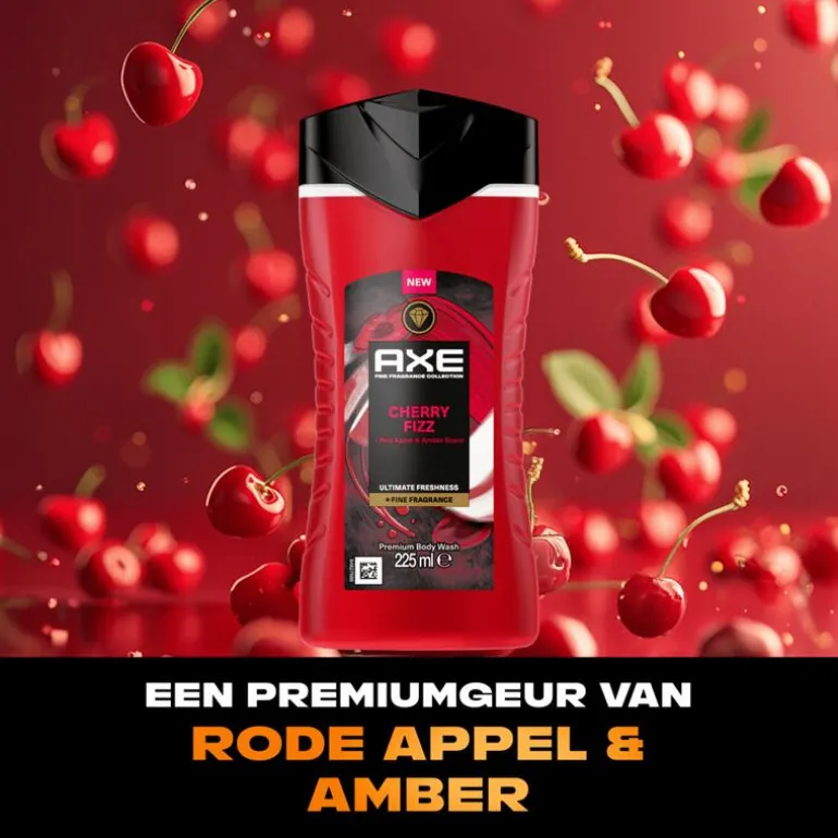 AXE Cherry Fizz Douchegel met de geur van rode appel en amber ruikt als een luxe parfum en houdt je 12 uur lang fris.