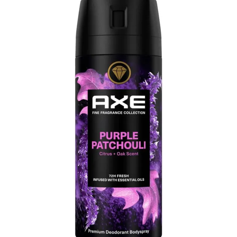 AXE FINE FRAGRANCE COLLECTION PURPLE PATCHOULI PREMIUM DEODORANT BODYSPRAY MET DE GEUR VAN CITRUSVRUCHTEN EN EIKENHOUT RUIKT ALS EEN PREMIUMPARFUM EN BESCHERMT EFFECTIEF ALS EEN DEO.