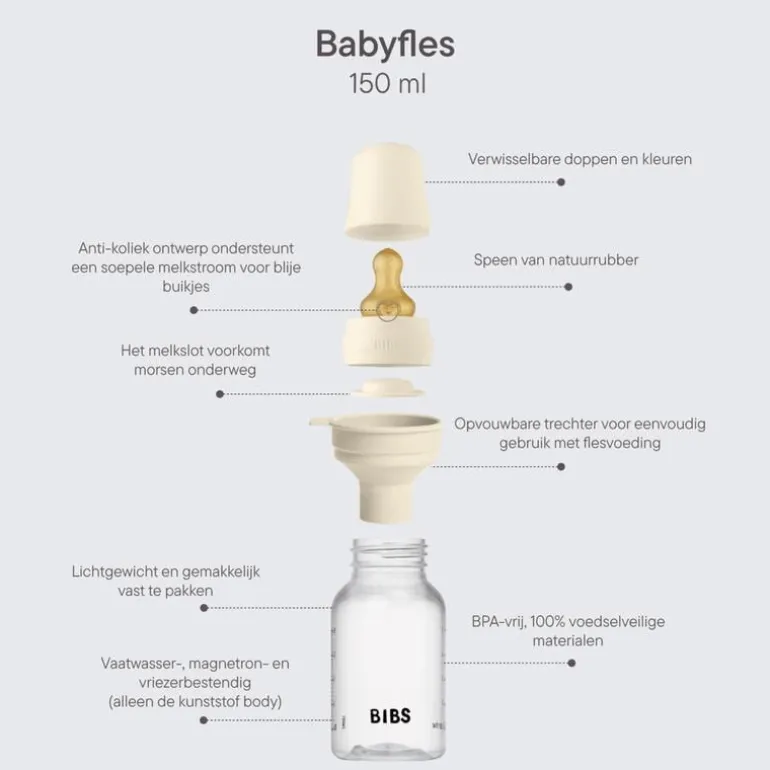 De flessen zijn speciaal ontworpen en ontwikkeld in het puurste en premium materiaal. Het is 100% veilig zonder schadelijke chemicaliën en brengt daardoor geen schadelijke stoffen over op de melk, waardoor het een gemakkelijke en veilige optie is voor ouders. De fles kan worden gebruikt en gematcht met de gehele BIBS collectie door kleur en vorm.