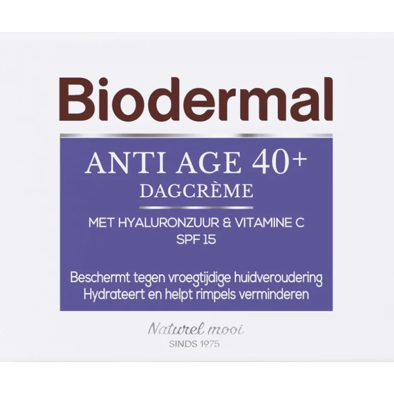 Rond het 40e levensjaar verliest de huid haar elasticiteit en veerkracht en ontstaan er rimpels. Anti Age 40+ Dagcrème van Biodermal helpt fijne lijntjes en rimpels te verminderen. Daarnaast verstevigt de crème de verslapte huid van gezicht en hals intensief. De huid krijgt meer volume, heeft een zichtbaar verstevigend effect en egaliseert bestaande rimpels. Dit resulteert in een huid die niet alleen mooier oogt maar ook strakker en gladder aanvoelt. Bevat SPF 15: beschermt tegen UVA- en UVB-straling.