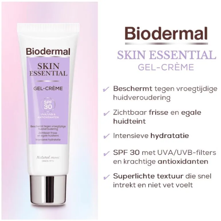 Probeer nu jouw superlichte alles-in-één dagcrème. Beschermt, verbetert én hydrateert jouw huid dankzij essentiële ingrediënten zoals SPF 30, krachtige antioxidanten en hyaluronzuur. Trekt snel in, voelt niet vet aan en verstopt de poriën niet. Voor een stralende huid met een gezonde glow! UV-straling en vrije radicalen zijn belangrijke oorzaken van vroegtijdige huidveroudering. Biodermal Skin Essential Gel-Crème bevat essentiële ingrediënten die de huid dagelijks nodig heeft voor bescherming, verbetering én hydratatie. De lichte textuur trekt snel in, voelt niet vet aan en verstopt de poriën niet. De gel-crème beschermt optimaal door SPF 30 met UVA- en UVB-filters en krachtige antioxidanten. Niacinamide en sarcosine verbeteren de huidteint en -textuur en hyaluronzuur hydrateert intensief.