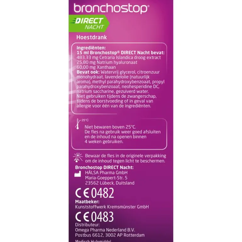 Nieuw van Bronchostop! Bronchostop DIRECT, hoestdrank speciaal voor de nacht. Last van hoesten tijdens een verkoudheid? Gebruik Bronchostop DIRECT Nacht voor directe verlichting van elke hoest* tijdens de nacht.De natuurlijke ingrediënten IJslands mos en hyaluronzuur werken als een balsem die het ontstoken slijmvlies in de keel bedekt en daardoor verzacht. Bronchostop DIRECT Nacht behandelt 5-in-1, bij: