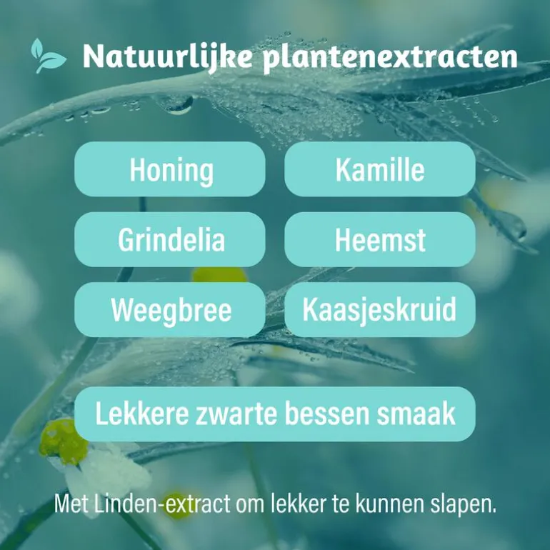 Dampo Kindersiroop Alle Hoest + Vrije luchtwegen Nacht bevat natuurlijke plantenextracten dieverlichting geven en een verzachtend effect hebben, bij zowel droge als vastzittende hoest. Dit zorgt vooreen betere nachtrust van je kind, Het vermindert het hoesten tijdens de nacht.