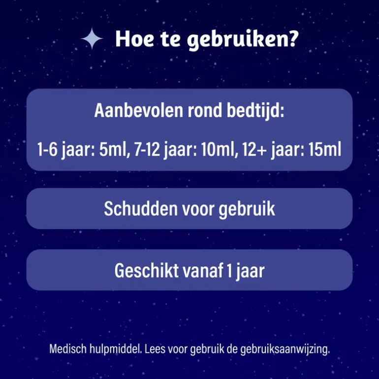 Dosering: Dampo Kids Alle Hoest Nacht is geschikt voor kinderen vanaf 1 jaar. De aanbevolen inname rond bedtijd is: – Van 1 t/m 6 jaar; 5 ml – Van 7 t/m 12 jaar, 10 ml – Van 13 t/m 18 jaar, 15 ml. Gebruik het bijgeleverde maatdopje. Sluit de dop goed na gebruik. Wanneer nodig kan de inname éénmaal per nacht worden herhaald. Lees voor gebruik de gebruiksaanwijzing. Vanwege de hoeveelheid plantenextracten kan het product kleine onopgeloste deeltjes bevatten; dit heeft geen effect op de kwaliteit. Dampo Kids Alle Hoest Nacht is een medisch hulpmiddel.