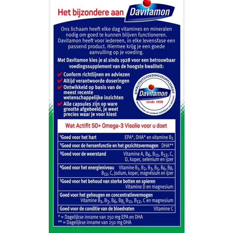 Davitamon Actifit 50+ Omega-3 Visolie is speciaal ontwikkeld voor volwassenen vanaf 50 jaar en voorziet in de dagelijkse aanvulling van vitamines en mineralen. Hierdoor is Davitamon Actifit 50+ Omega-3: