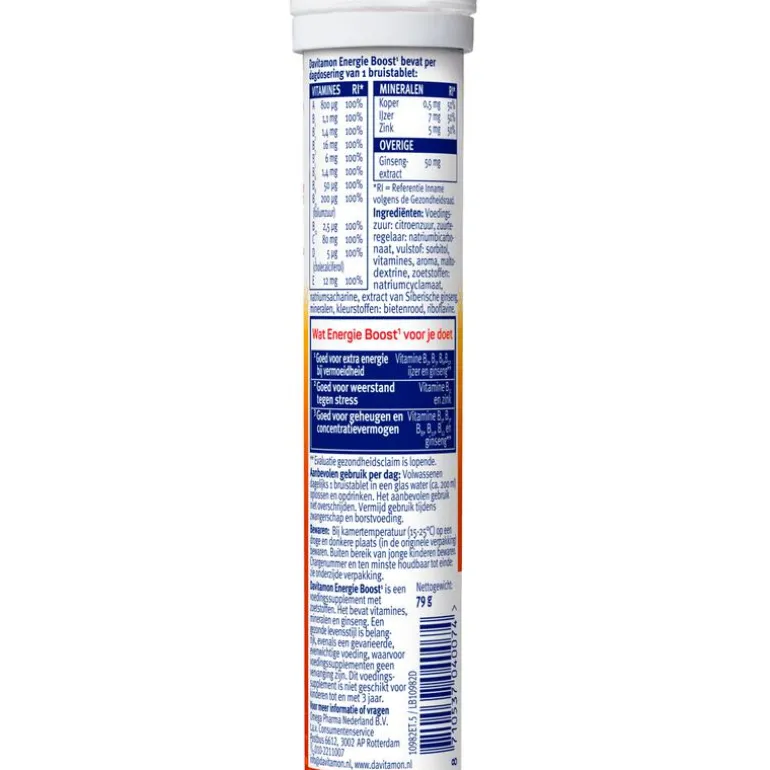 Davitamon Energie Boost¹ Ginseng bruistabletten kunnen ondersteuning bieden bij vermoeidheid, bij lusteloze gevoelens of in drukke perioden. De vijftien vitamines en mineralen én het natuurlijk plantenextract in Davitamon Energie Boost¹ Ginseng zijn: