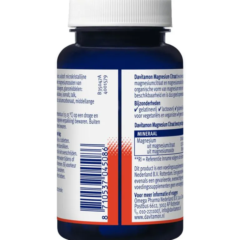 Davitamon Magnesium citraat 50+10 GRATIS. Magnesium speelt een essentiële rol bij verschillende lichaamsfuncties. Het is onder andere belangrijk voor de energiestofwisseling, speelt een rol bij het behoud van sterke spieren en botten en draagt bij tot de vermindering van vermoeidheid. *Davitamon magnesiumcitraat bevat een combinatie van magnesiumcitraat en magnesiumoxide. Magnesiumcitraat is een organische vorm van magnesium met een hoge biiologische beschikbaarheid en is dus goed opneembaar.. Davitamon magnesiumcitraat bevat een hoge dosering magnesium in een kleine, gemakkelijk in te nemen tablet.