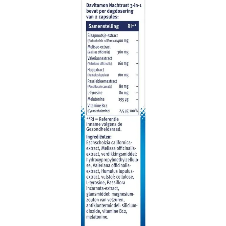 Davitamon Nachtrust 3-in-1 ondersteunt in 3 verschillende aspecten van het behoud van een goede nachtrust: het helpt om sneller in slaap te vallen, is goed voor de slaapkwaliteit en helpt om uitgerust wakker te worden. De formule bevat hiervoor een combinatie van natuurlijke extracten van valeriaan, passiebloem, slaapmutsje, hop en melisse.