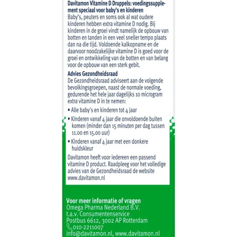 Nieuw van Davitamon: Davitamon Vitamine D Druppels voor baby’s en kinderen 0-4 jaar. Davitamon Vitamine D Druppels is een voedingssupplement speciaal voor baby’s en kinderen. Baby’s, peuters en soms ook al wat oudere kinderen hebben extra vitamine D nodig. Bij kinderen in de groei vindt namelijk de opbouw van botten en tanden in een veel sneller tempo plaats dan na die tijd. Voldoende kalkopname en de daarvoor noodzakelijke vitamine D is goed voor de groei en ontwikkeling van de botten en van belang voor de opbouw van een sterk gebit.