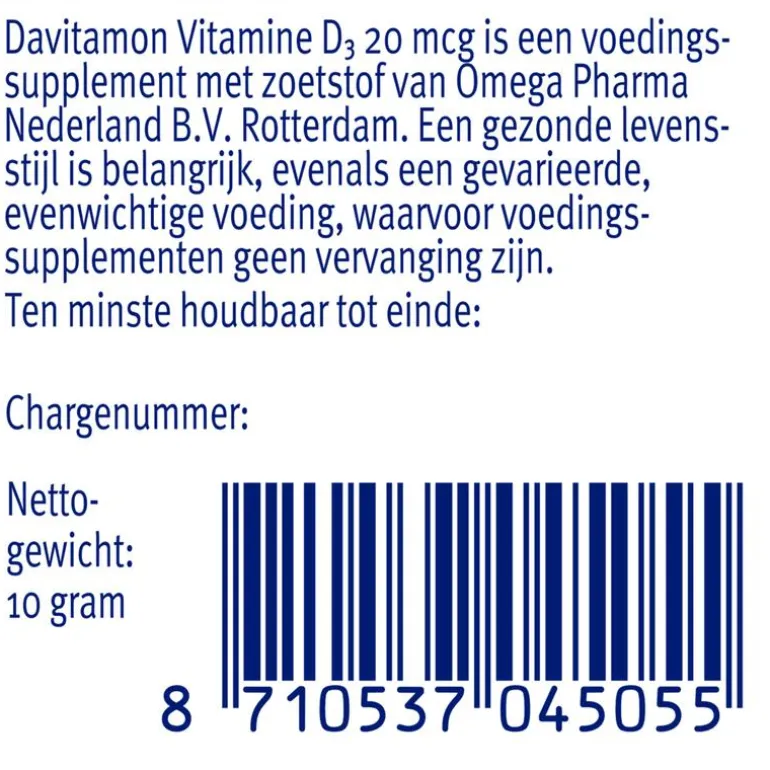 Davitamon Vitamine D3 20 mcg 60+15 gratis is een voedingssupplement dat speciaal is ontwikkeld voor volwassenen om in een verhoogde behoefte aan vitamine D te voorzien. Het is ook geschikt als dagelijkse aanvulling voor volwassenen vanaf 70 jaar. Vitamine D speelt een essentiele rol bij verschillende lichaamsfuncties zoals opname van calcium en fosfor uit de voeding en het behoud van sterke botten en tanden. Ook ondersteunt vitamine D een goede werking van de spieren.