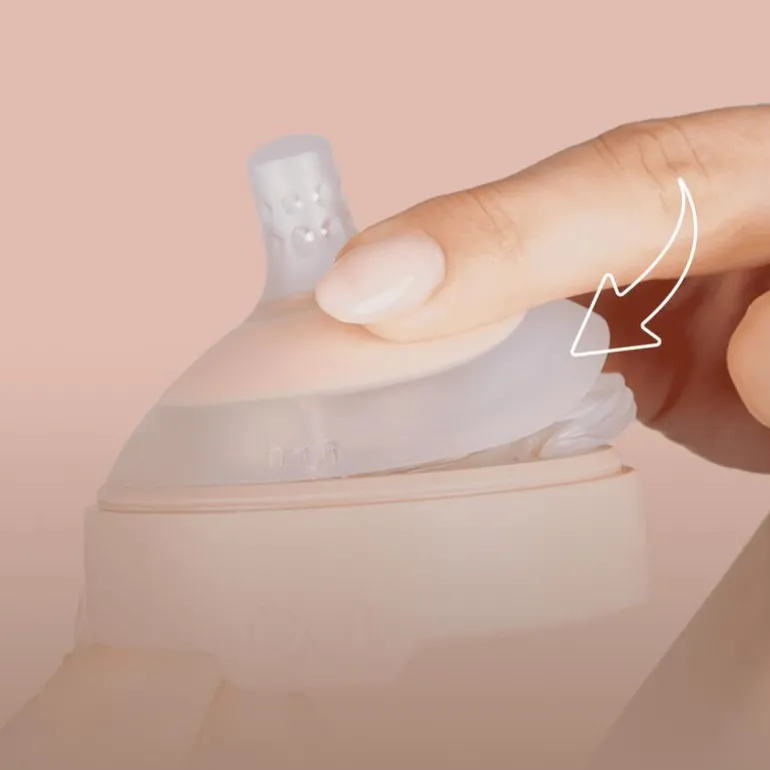 De stevige, brede basis met soft coating zorgt voor een hechte aansluiting op de flessenspeen. De mond van de baby wordt door de stevige basis ondersteund en helpt bij een juiste positie van de lippen. De soft coating biedt extra grip tijdens het drinken en voorkomt dat de mond op het speenoppervlak glijdt.