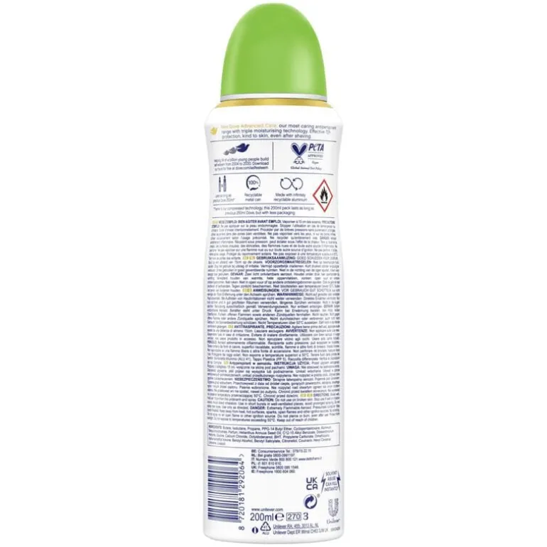 Dove ondersteunt vrouwen wereldwijd bij het realiseren van hun volledige potentiële en individuele schoonheid door verzorgingsproducten te ontwikkelen die inspelen op de persoonlijke behoeften van hun huid en haar. Want wij geloven dat wie zich mooi en lekker in zijn vel voelt met de hulp van de juiste verzorging, dat ook kan uitstralen. Om de impact op het mileu te verminderen hebben de Dove anti-transpiranten en deodoranten een andere verpakking gekregen. De aluminium spuitbus van deze anti-transpirant is 100% en oneindig recyclebaar. De Dove anti-transpirant deodorants zijn vegan en dragen het PETA-approved keurmerk.