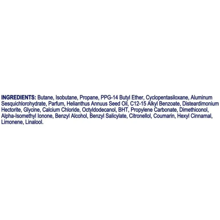 Butane, Isobutane, Propane, PPG-14 Butyl Ether, Cyclopentasiloxane, Aluminum Sesquichlorohydrate, Parfum, Helianthus Annuus Seed Oil, C12-15 Alkyl Benzoate, Disteardimonium Hectorite, Glycine, Calcium Chloride, Octyldodecanol, BHT, Propylene Carbonate, Dimethiconol, Alpha-Isomethyl Ionone, Benzyl Alcohol, Benzyl Salicylate, Citronellol, Coumarin, Hexyl Cinnamal, Limonene, Linalool.