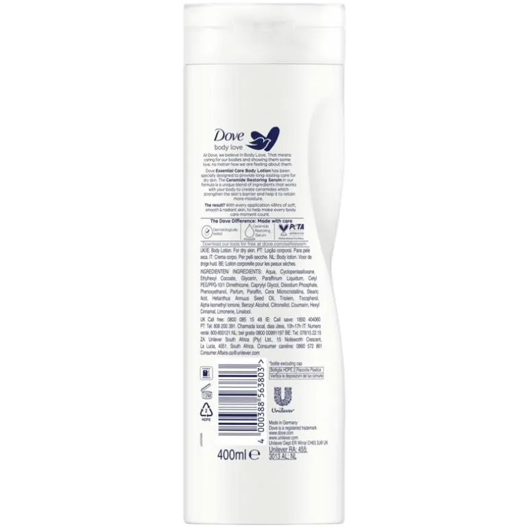 Bij Dove geloven we in ‘Body Love’. Dat betekent dat we voor ons lichaam zorgen en wat liefde tonen, ongeacht hoe we over ons lichaam denken. Zet om te beginnen je dagelijke huidverzorging om in een ontspanmomentje. Met Dove Body Love Essential Care Bodylotion geef je jezelf langdurige verzorging voor een gladde, zachte en stralende huid. Bescherming tegen een droge huid begint met je huid de zorg te geven die het verdient. Dove Body Love Essential Care Bodylotion is geformuleerd met een uniek Ceramide Restoring Serum, deze mix van ingrediënten werkt samen met je lichaam om natuurlijke ceramiden te creëren. Dit helpt het huidoppervlak van binnenuit af te sluiten en de barrière te versterken om vochtverlies te voorkomen. Dove Body Love Essential Care Bodylotion houdt het vocht tot 48 uur vast en voedt diep* in het huidoppervlak en maakt de huid zacht, glad en stralend. Zorgvuldig ontwikkeld om ervoor te zorgen dat je dagelijkse lichaamsverzorgingsroutine een daad van zelfzorg is, deze rijke bodylotion zal de zichtbare droogheid na één keer verminderen. Voor een stralende, gladde en zachte huid, die lang aanhoudt. Het is essentiële zorg, speciaal voor jou.* Binnen het stratum corneum
