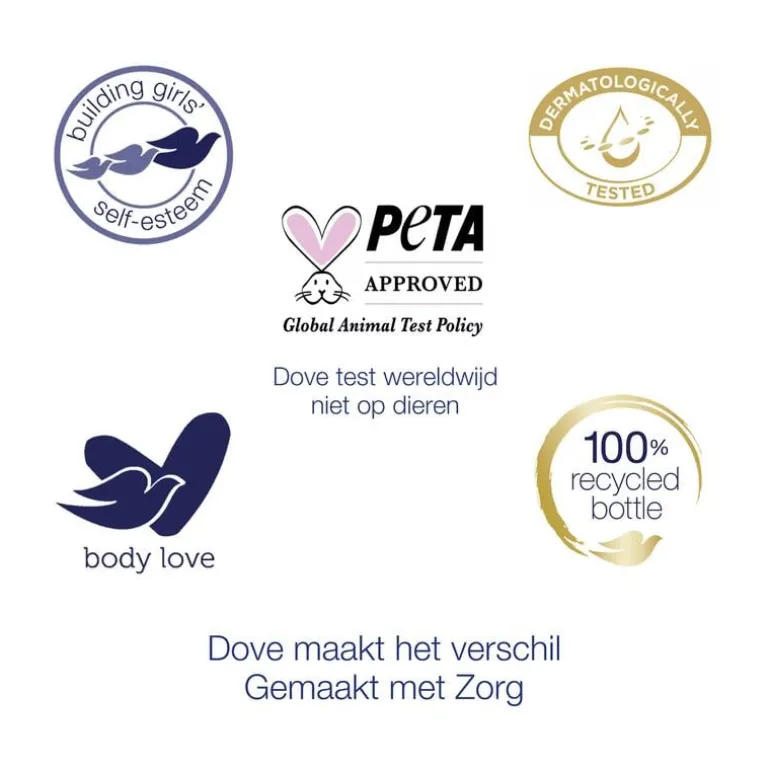 Dove zet zich in om te investeren in duurzamere plastic keuzes om het gebruik van nieuw plastic te verminderen. Daarom zijn alle Dove-flessen gemaakt van 100% gerecycled plastic**. En als je houdt van huidverzorgingsproducten die zowel voor de planeet als voor je huid zorgen, zoek dan niet verder dan Dove Body Love. Dove test namelijk nergens ter wereld op dieren en is PETA-gecertificeerd Cruelty-Free.** Exclusief dop
