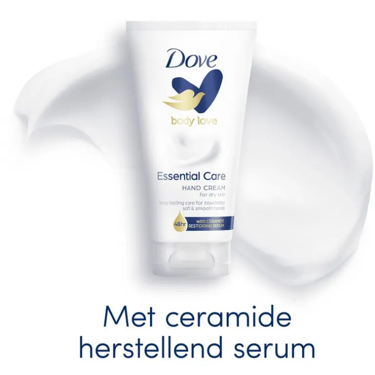 DOVE BODY LOVE ESSENTIAL CARE HANDCRÈME, VERRIJKT MET CERAMIDE RESTORING SERUM, VOOR GEHYDRATEERDE ZACHTE HANDEN.• Dove Body Love Essential Care Handcrème voor gehydrateerde zachte huid• De snel absorberende handcrème geeft tot 48 uur hydratatie• De handcrème is geschikt voor droge handen en van alle huidtypen• Ceramide Restoring Serum helpt je huid om de huidbarrière te versterken• De crème is dermatologisch getest en PETA-gecertificeerd• Voeg de hydraterende handcrème toe aan je dagelijkse skincare routine