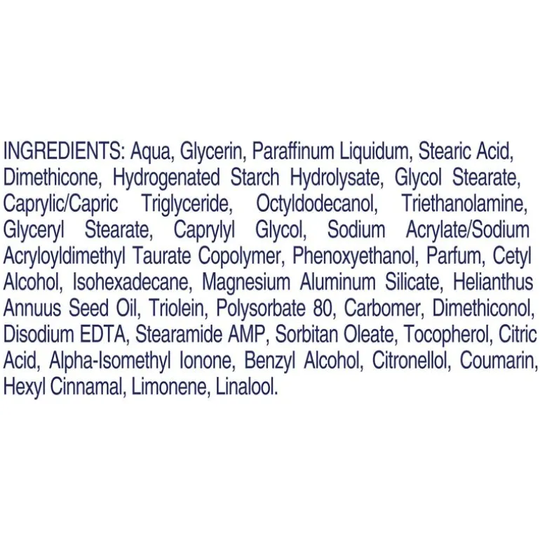 Aqua, Glycerin, Paraffinum Liquidum, Stearic Acid, Dimethicone, Hydrogenated Starch Hydrolysate, Glycol Stearate, Caprylic/CapricTriglyceride, Octyldodecanol, Triethanolamine, Glyceryl Stearate, Caprylyl Glycol, Sodium Acrylate/Sodium Acryloyldimethyl Taurate Copolymer,Phenoxyethanol, Parfum, Cetyl Alcohol, Isohexadecane, Magnesium Aluminum Silicate, Helianthus Annuus Seed Oil, Triolein, Polysorbate 80,Carbomer, Dimethiconol, Disodium EDTA, Stearamide AMP, Sorbitan Oleate, Tocopherol, Citric Acid, Alpha-Isomethyl Ionone, Benzyl Alcohol, Citronellol, Coumarin, Hexyl Cinnamal, Limonene, Linalool.