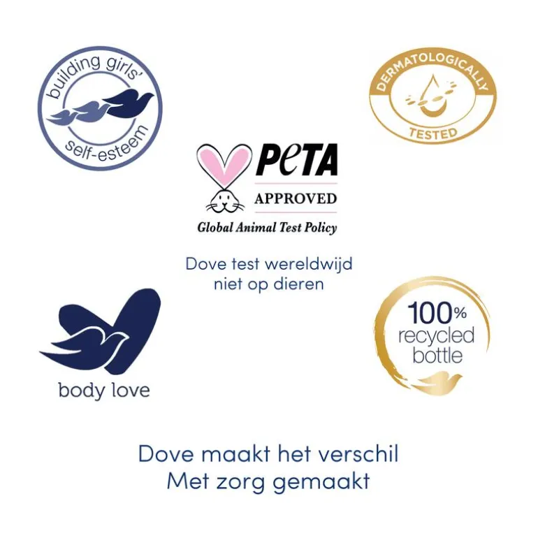Wanneer het om huidverzorging gaat, willen wij van Dove je producten geven waar je op kunt vertrouwen. Maar de zorg van Dove gaat verder dan alleen onze producten. We willen zorg dragen voor alle vrouwen, we willen schoonheidsnormen opnieuw definiëren en iedereen helpen om schoonheid en lichaamsbeeld op een positieve manier te ervaren. Onze missie is ervoor te zorgen dat de volgende generatie opgroeit met een positief beeld over zichzelf en hun uiterlijk. Via het Dove Self-Esteem Project willen we ervoor zorgen dat er in de wereld waarin deze generatie terechtkomt geen plaats is voor onrealistische schoonheidsidealen. Hoe we onze producten maken en wat erin gebruikt wordt, de impact die we hebben op onze planeet en het streven naar een betere, duurzamere manier van leven is belangrijk voor ons.