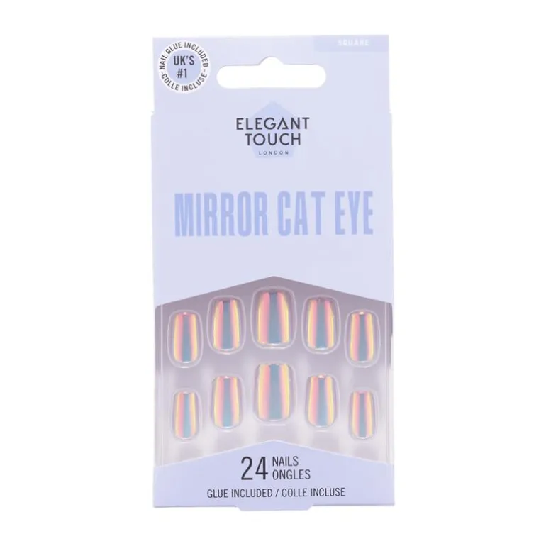 Elegant Touch Mirror Cat Eye Opaline. Nepnagels met Lijm 24st. Maak kennis met onze revolutionaire nieuwe Mirror Cat Eye Nail. Krijg 2 dynamische afwerkingen in één, met behulp van gemagnetiseerde technologie om een reflecterend cat eye-effect te creëren dat beweegt met het licht terwijl jij beweegt. Afgewerkt met een iriserende chrome topcoat voor de glanzende “mirror” effect en multidimensionale schittering.