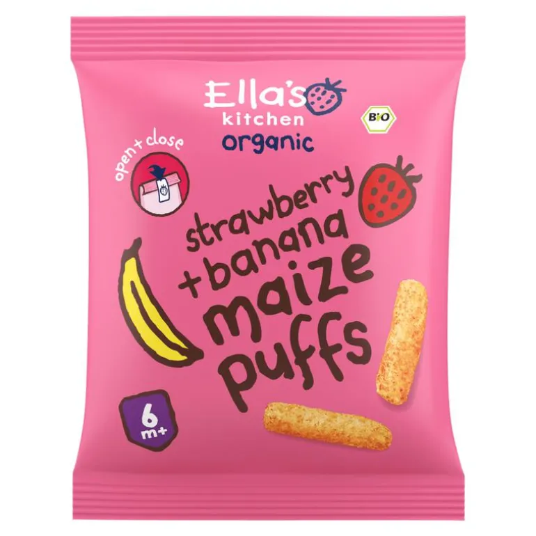 100% biologisch tussendoortje. Gepofte mais puffs met banaan + aardbei. De perfecte grootte + vorm om kleintjes te leren om hun eigen eten te pakken en smelt in kleine mondjes! Vanaf 6 maanden.