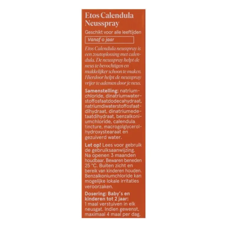 Etos Calendula Neusspray is een isotone oplossing, met een zoutgehalte dat geschikt is om het neusvlies te reinigen. Etos Calendula Neusspray kan worden gebruikt om: • De neus te bevochtigen wanneer ze droog is bij geringe luchtvochtigheid (bijvoorbeeld in verwarmde ruimtes of ruimtes met airconditioning, bij grote hoogte, vliegreizen). • Het neusslijmvlies zachtjes te reinigen zodat de baby of het kind vrijer kan ademen.