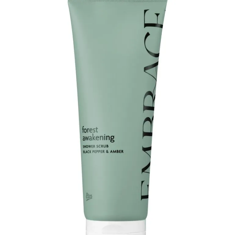 Etos Embrace Shower Scrub Forest Awakening is een exfoliërende douchescrub met kokosnootolie en natuurlijke abrikoos en kokosnoot scrubdeeltjes.