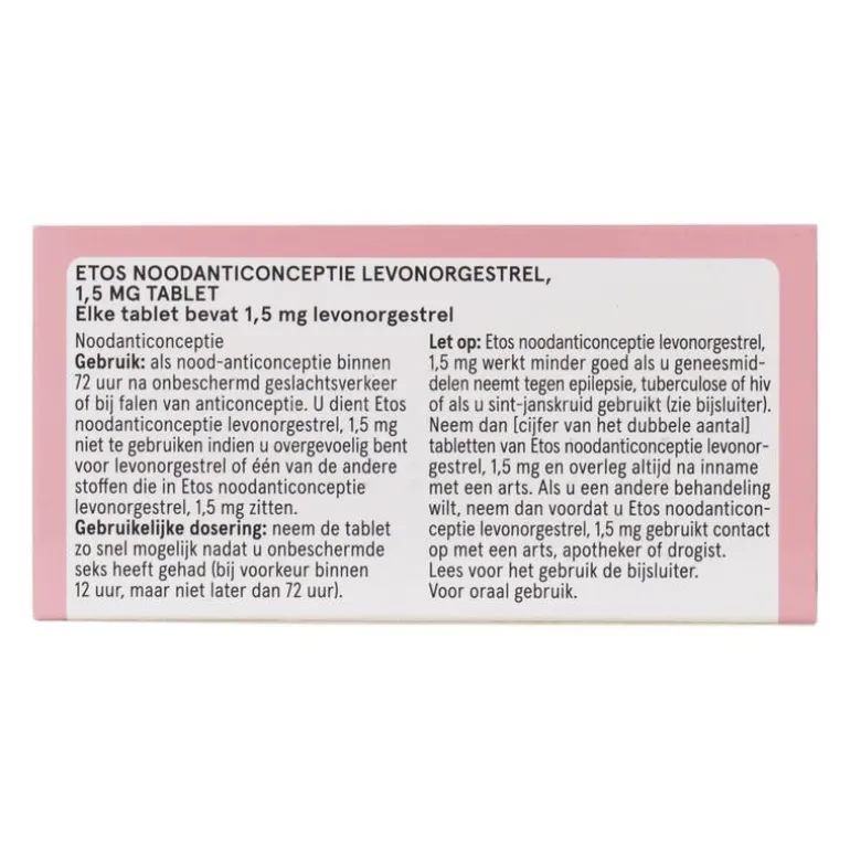 Etos Noodanticonceptie levonorgestrel 1,5 mg is een anticonceptiemiddel dat bedoeld is om zwangerschap te voorkomen na onbeschermde geslachtsgemeenschap of wanneer een anticonceptiemiddel niet heeft gewerkt.