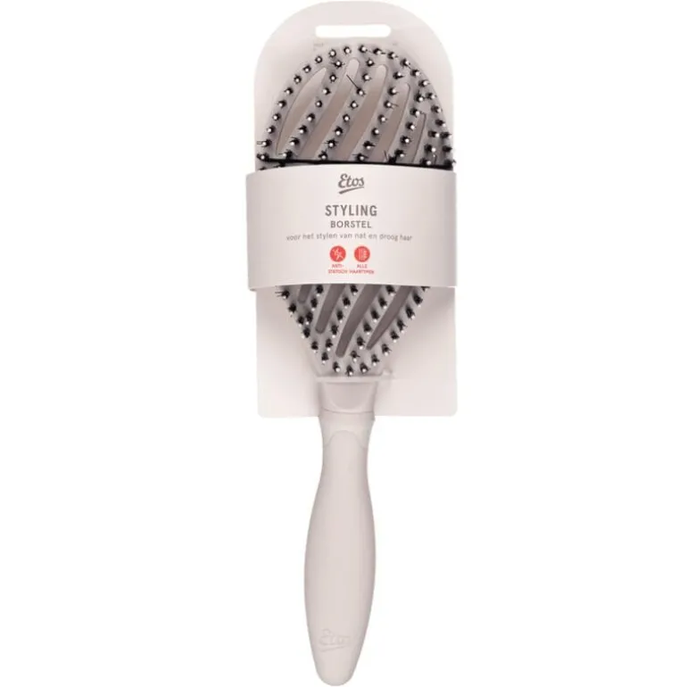De Etos Styling Borstel is perfect voor het creëren van verschillende haarstijlen en het in model brengen van je haar. Deze ovale borstel is flexibel en voorzien van zachte, maar stevige nylon pennen, waardoor je haar soepel door de borstel glijdt zonder te beschadigen. Ideaal voor dagelijks gebruik en geschikt voor alle haartypes.