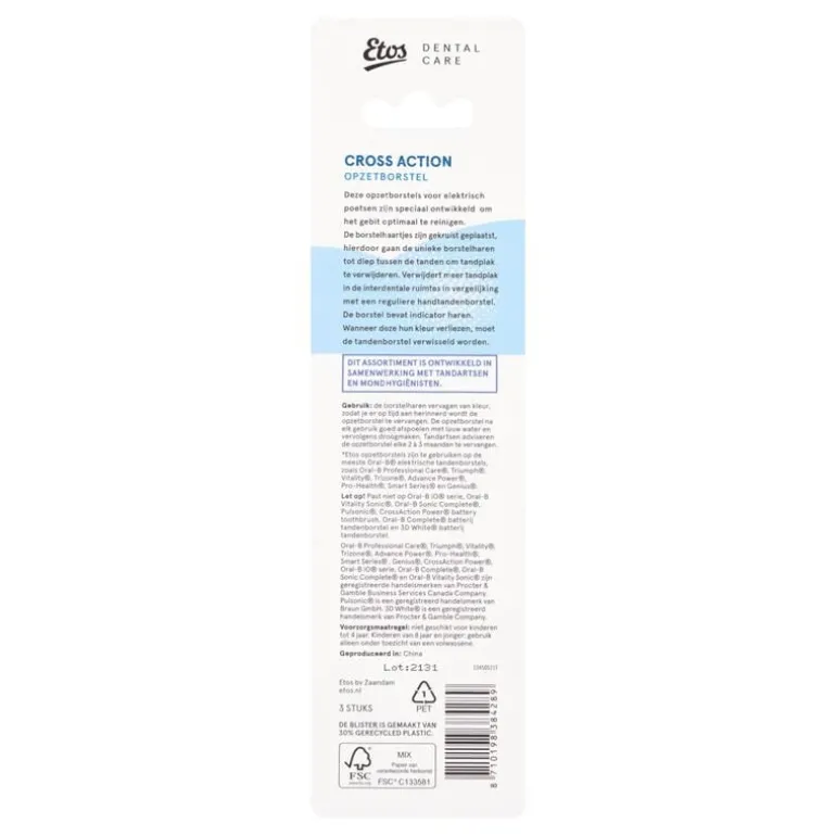 Etos Cross action opzetborstels voor elektrisch poetsen zijn speciaal ontwikkeld om het gebit optimaal te reinigen.