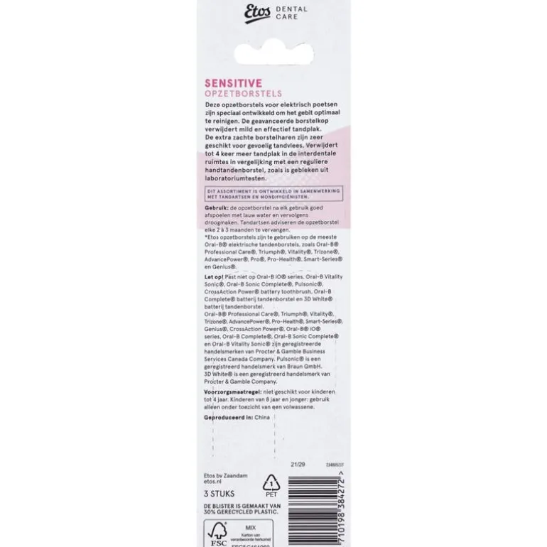 *Etos opzetborstels zijn te gebruiken op de meeste Oral-B® elektrische tandenborstels, zoals Oral-B® Professional Care®, Triumph®, Vitality®, Trizone®, AdvancePower®, Pro®, Pro-Health®, Smart-Series® en Genius®.