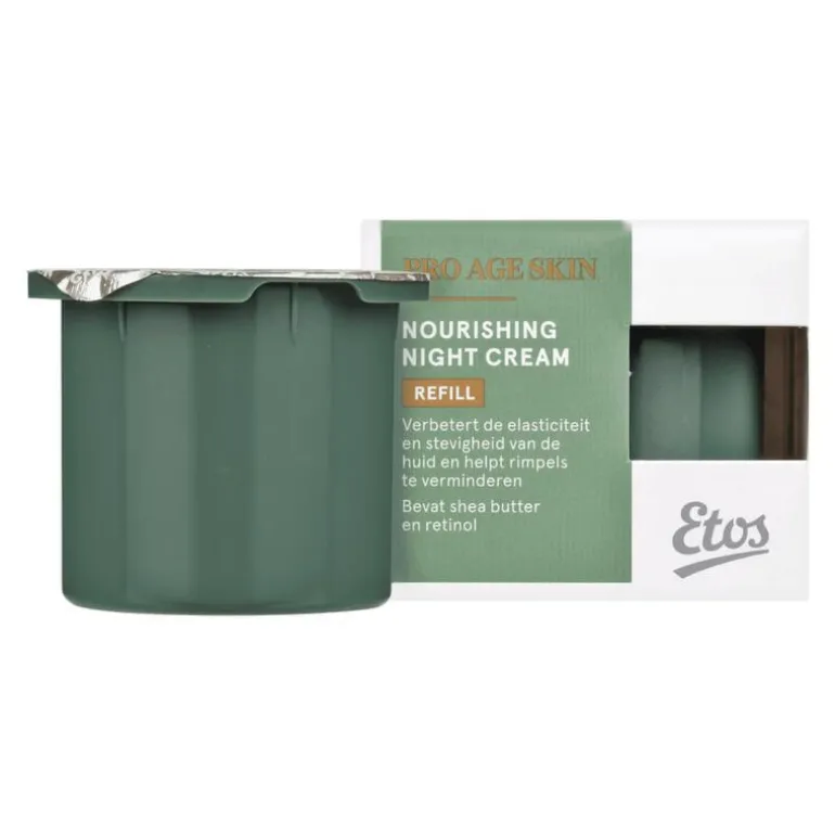Deze hervulbare cup voor de nachtcrème is onderdeel van de Pro Age Skin-lijn van Etos Merk. De Pro Age Skin-lijn bestaat naast de nachtcrème ook uit een dagcrème (plus hervulbare cup), serum, rimpelfiller en oogcrème.