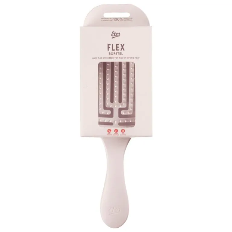 De Etos Flex Borstel is ontworpen om zich flexibel aan te passen aan de vorm van je hoofd, waardoor het borstelen van je haar comfortabeler wordt. Deze buigzame borstel is voorzien van flexibele, nylon pennen die zacht door je haar glijden zonder te trekken of te breken. Ideaal voor het ontklitten van zowel nat als droog haar, deze borstel is geschikt voor alle haartypes en zorgt voor een glad en klitvrij resultaat.