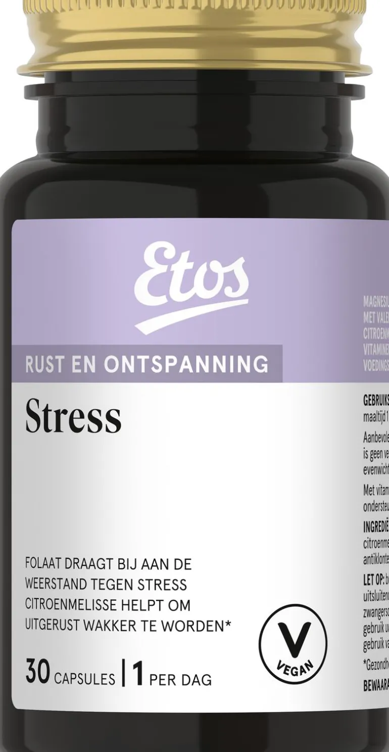 Etos Stress capsules zijn speciaal samengesteld ter ondersteuning in stressvolle situaties. De formule bevat onder andere magnesium, foliumzuur, citroenmelisse- en valeriaanextract, aangevuld met vitamine B5 en B12. Foliumzuur draagt bij aan de weerstand tegen stress en vitamine B5 ondersteunt het lichaam in stresssituaties. Vitamine B12 is goed voor het concentratievermogen. Een voedingssupplement is geen vervanging van een gevarieerde voeding en een gezonde levensstijl.