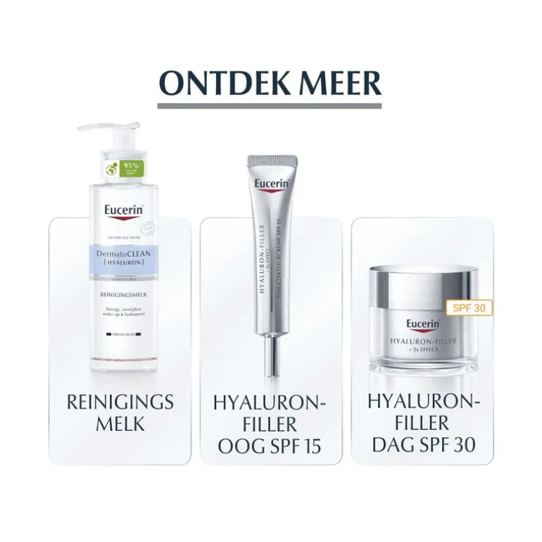 Een effectieve anti-rimpel nachtcrème die zelfs de diepste rimpels van binnenuit opvult en de nachtelijke regeneratie ondersteunt, met 3x EFFECT: 1. Vult 2. Stimuleert 3. Beschermt De formule van Eucerin Hyaluron-Filler Nachtcrème is een geavanceerde anti-rimpelcrème voor de dunne huid, speciaal voor de nacht. De formule bevat 2 soorten moleculen van Hyaluronzuur om rimpels meer doelgericht van binnenuit op te vullen. Daarnaast bevat de formule Bio-actieve Saponine, dat de productie van hyaluronzuur ondersteunt. Geconcentreerde dexpanthenol ondersteunt het huidherstel gedurende de nacht. Bij regelmatig gebruik wordt de huid gladder, terwijl lijntjes en rimpels zichtbaar verminderen.