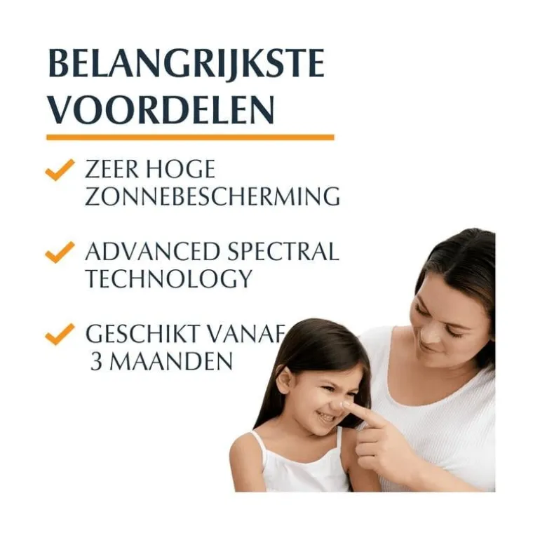 Eucerin Sun Sensitve Protect Kids Gel-Crème SPF 50+ met Advanced Spectral Technology: Combineert UVA/UVB-filters voor een zeer hoge UV-bescherming en antioxidant Licochalcone A, dat vrije radicalen gegenereerd door UV en hoog energetisch zichtbaar licht neutraliseert. Glycyrrhetinezuur ondersteunt het natuurlijk mechanisme van de huid.