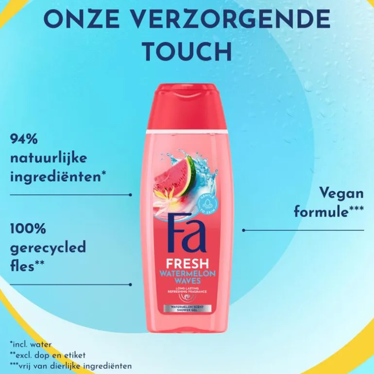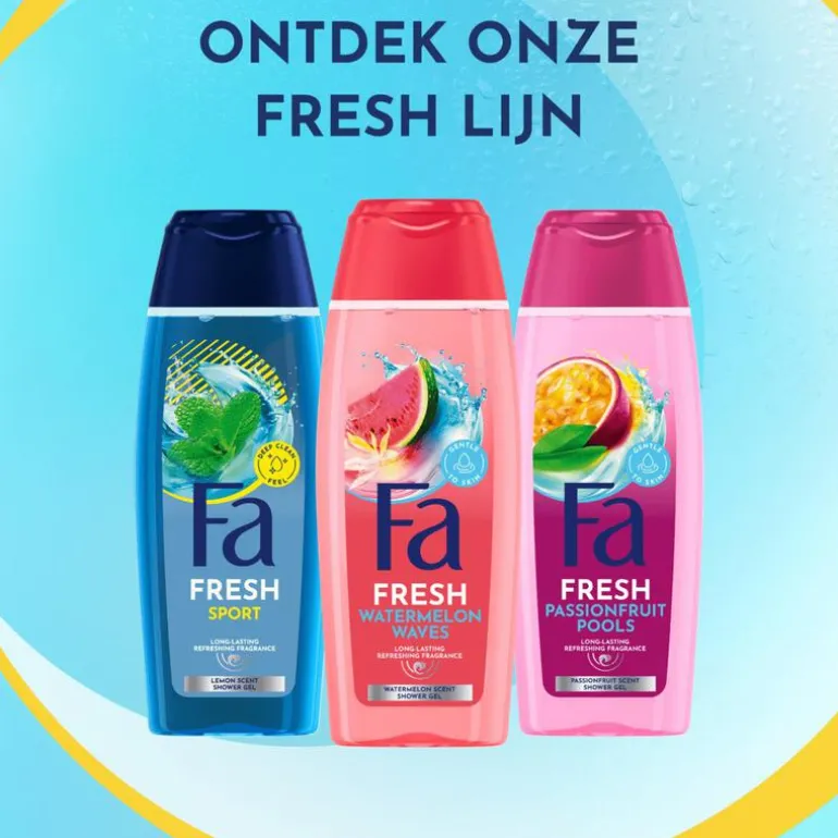 Fa, Durf te ontdekken! Fa biedt een innovatieve lichaamsverzorgingslijn, die de zintuigen verwent en de huid een onweerstaanbaar gevoel geeft. Van zoet tot fruitig, bloemig of gewoon lekker fris, Fa biedt voor elk avontuur een passende douchegel en deodorant. Verfris je lichaam en laat je zintuigen elke dag weer een andere wereld ontdekken.