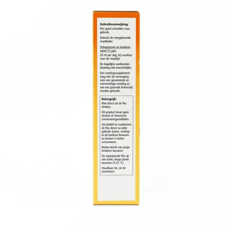 De dagelijkse aanbevolen dosering niet overschrijden. Voedingssupplementen mogen niet als vervanging voor een gevarieerde voeding worden gebruikt. Kies voor een gezonde levensstijl. Belangrijk: Niet direct uit de fles drinken. Dit product bevat geen alcohol of chemische conserveringsmiddelen.