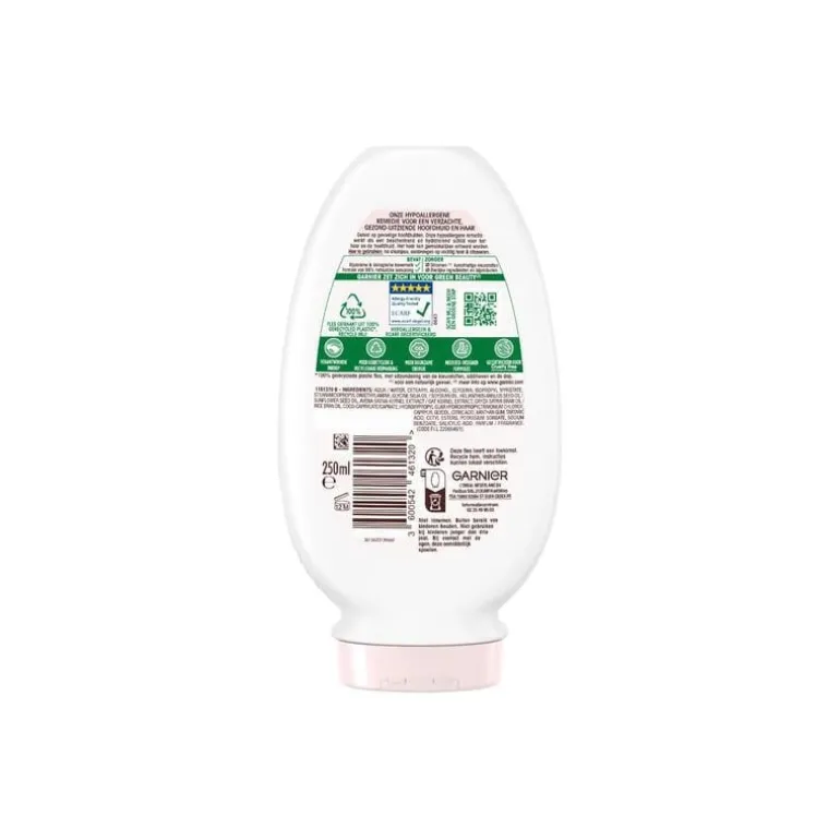 De Loving Blends Milde Haver Conditioner van Garnier is een hypoallergene conditioner (ECARF gecertificeerd) van 97% natuurlijke oorsprong, speciaal ontwikkeld voor normaal haar en een gevoelige hoofdhuid. De conditioner ontwart, hydrateert en verzacht het haar en beschermt het haar over de gehele lengte. Garnier Loving Blends heeft een formule samengesteld die twee zachte ingrediënten combineert: – Rijstcrème, bekend om zijn hydraterende en beschermende werking op het haar – Biologische havermelk, gebruikt om de gevoelige huid te verzorgen en bekend om de kalmerende en verzachtende werking op de gevoelige hoofdhuid. Het haar is eenvoudig in model te brengen, soepel, glanzend, zijdezacht en beschermd over de gehele lengte. Formule zonder siliconen, voor een natuurlijk gevoel en zonder dierlijke ingrediënten & bijproducten in een 100% gerecyclede en recyclebare fles. Loving Blends is gecertificeerd door Cruelty Free International. Ontdek voor nog meer verzorging ook de bijhorende shampoo en het haarmasker.