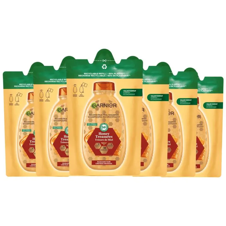 Minder plastic*, m€€r voordeel. Word ook een shampoo refiller! Garnier Loving Blends Honing Goud Shampoo Refill is jouw vertrouwde shampoo, maar nu hervulbaar. Garnier Loving Blends Honing Goud Shampoo is de ideale keuze voor beschadigd en breekbaar haar. Deze herstellende shampoo combineert de voedende kracht van acacia, manuka & lavendel honing met een duurzame oplossing: een recyclebare refill van 250 ml. Garnier Loving Blends Honing Goud Shampoo voedt je haar en herstelt zichtbaar de tekenen van schade, zoals 10 minder haarbreuk**, 2x minder gespleten punten*** en 53% minder haarscheuren***. De navulbare verpakking van deze shampoo bevat 60% minder plastic**, wat het eenvoudig maakt om bij te dragen aan een duurzamere levensstijl terwijl je je haar intensief verzorgt. *Deze shampoo is gemaakt van 60% minder plastic in vergelijking met het gebruik van onze 250ml fles shampoo. **Instrumentele test. **Oppervlakteschade, Instrumentele test na het gebruik van shampoo + masker. ***Instrumentele test na gebruik van shampoo en conditioner of na het masker alleen.
