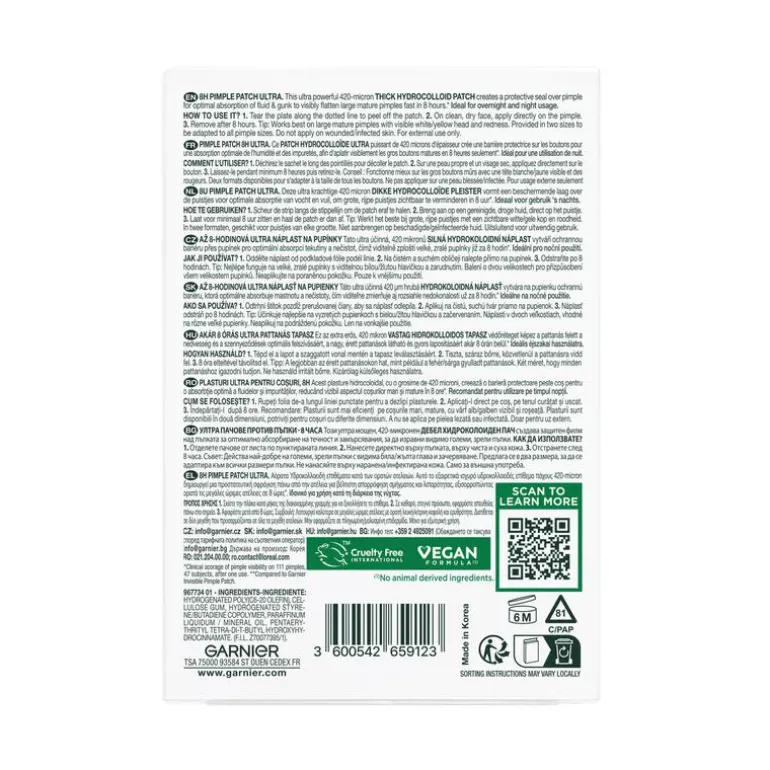 Ontdek Garnier PureActive Pimple Patch Ultra: deze ultra krachtige 420 micron dikke hydrocollïde patch vormt een beschermende laag over de puistjes voor optimale absorptie van vocht en vuil, om grote, rijpe puistjes zichtbaar te verminderen in 8 uur*. Ideaal voor gebruik ’s nachts.