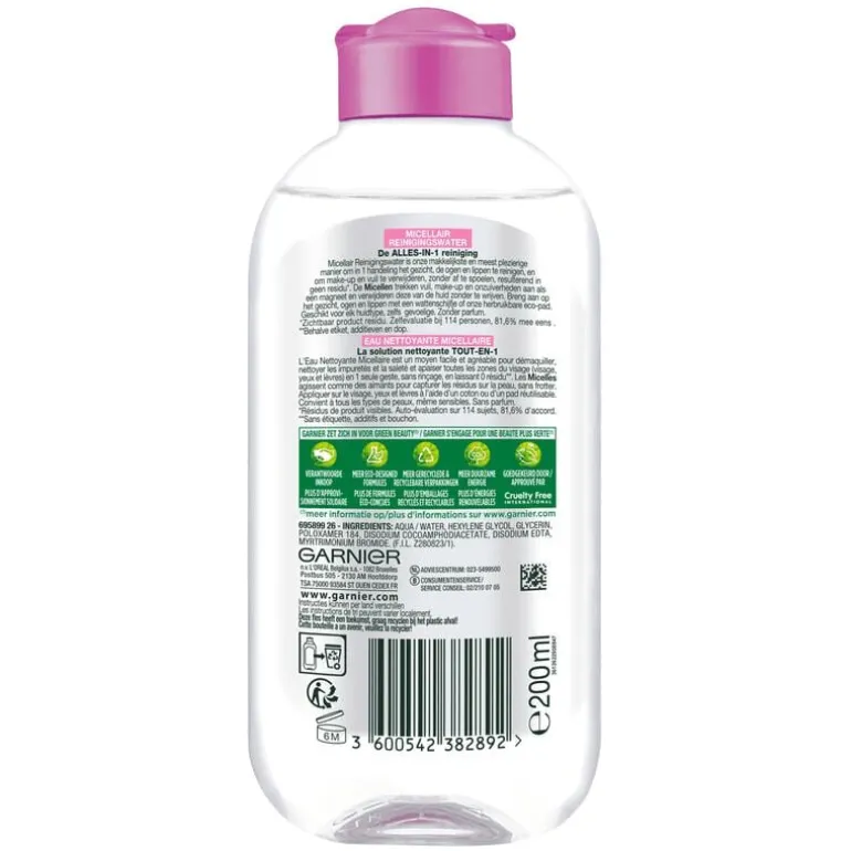 Garnier Micellair reinigingswater is een oplossing met een zachte, geurloze formule en is geschikt voor alle huidtypes, ook voor de meest gevoelige huid. Het micellair water is verrijkt met micellen die afkomstig zijn uit de farmacie. Het zijn reinigende deeltjes die als een magneet onzuiverheden, make-up en talg op de huid aantrekken en zo van de huid verwijderen, zonder te wrijven.